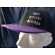 Black cap with purple peak and detail. Printed offset in silver says