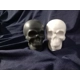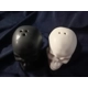 A pair of ceramic skulls, one black for pepper and one white for salt, fill using plastic stopper at base