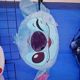Plush stitch face shaped fluffy cushion with floppy ears, in shades of blue and black sewn details